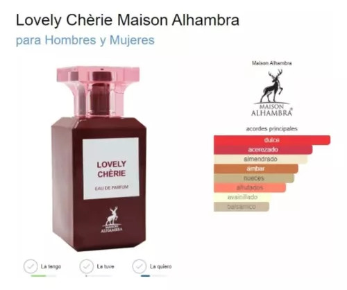 Lovely Chèrie de Maison Alhambra es una fragancia de la familia olfativa para Hombres y Mujeres. Las Notas de Salida son almendra amarga y rosa; las Notas de Corazón son cereza, Cereza negra y ámbar; las Notas de Fondo son haba tonka, tófe y bálsamo del Perú.